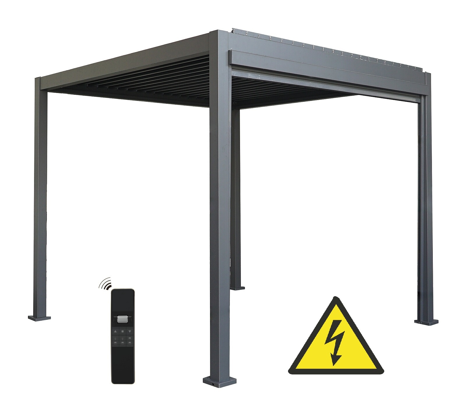 Zahradní hliníková pergola s vodorovnou střechou, s elektrickým ovládaním střechy a LED osvětlením. V pergole naleznete příjemné místo k odpočinku v horkých letních dnech. Střecha je složená z desítek otočných lamel a ochrání Vás před nepříznivým počasím. Lamely je možné elektricky na dálkové ovládání otáčet v úhlu 0 až 120o. Úhel natočení 90o zajistí otevřenou střechu a úhel 0o zcela uzavřenou střechu. Lamely lze nastavit i do pouze pootočeného stavu (max 120o tím regulovat množství slunečního světla pronikajícího do pergoly. Konstrukce je vyrobená z odolné hliníkové slitiny a je nastříkaná práškovou vypalovanou barvou (komaxit), a proto odolává přírodním klimatickým vlivům.