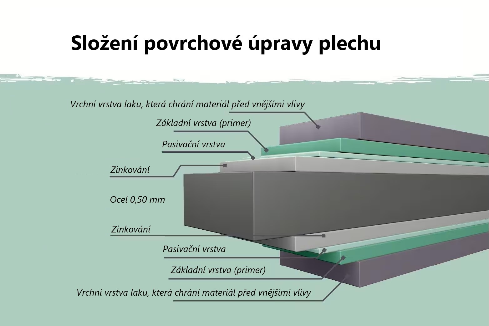 Trapézový plech je pečlivě práškově lakován, což nejen dodává estetický vzhled, ale také zajišťuje vynikající odolnost vůči nepříznivým povětrnostním vlivům. Rám z pozinkovaných čtvercových ocelových trubek zaručuje stabilitu a pevnost konstrukce. Světelný pás z umělého skla umožňuje pronikání přirozeného světla do interiéru, čímž vytváří příjemnou, světlou a pohodovou atmosféru uvnitř domku. Součástí dodávky je kvalitní okap, který efektivně odvádí dešťovou vodu.