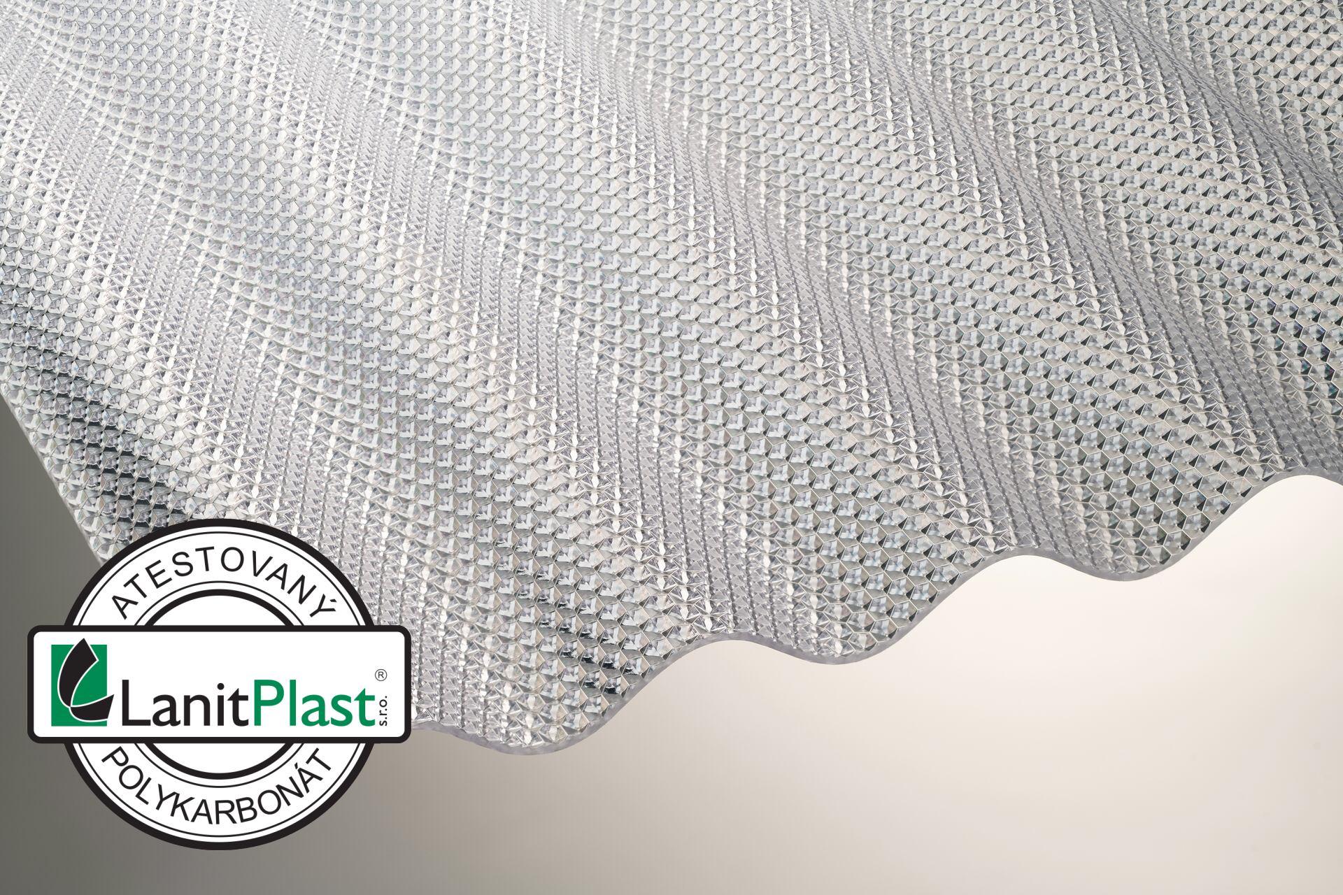 MARLON CSE Diamond - extrémně robustní vlnité polykarbonátové desky síly 2,6 mm s povrchovou strukturou - vytlačené šestihrany podobné plástvím na vnitřní straně určené pro rozptyl světla. Povrchová struktura láme světlo, takže desky nejsou úplně průhledné, ale průsvitné a vzniká pod nimi příjemný jemný chládek při zachování světelné propustnosti. Část paprsků díky svému lomu na krupičce zůstane v materiálu, takže deska se při nasvícení sluncem rozzáří. Povrchová struktura je vyrobena mechanicky vylisováním na vnitřní povrch desky. Desky mají zesílený oboustranný koextrudovaný (přitavený) 2UV filtr, vlivem slunce nežloutnou ani nekřehnou.
