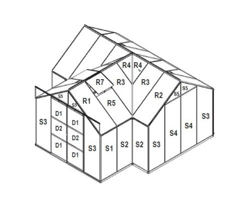 Obsah balenia a rozmery jednotlivých dosiek náhradného presklenia pre skleník SIRIUS: