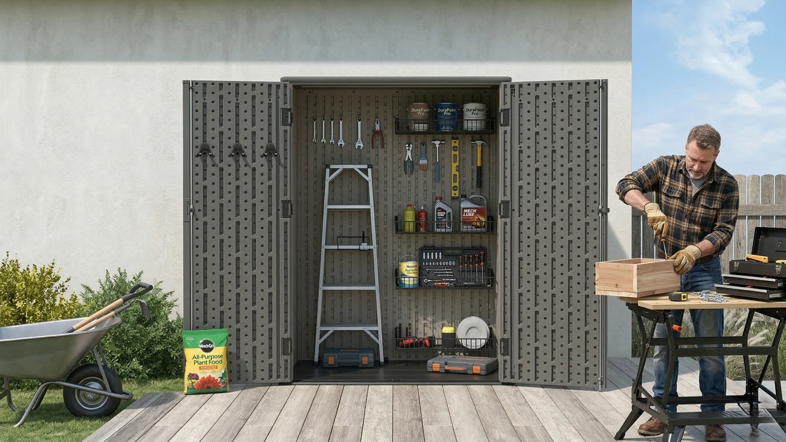 Plastový záhradný box, vrátane podlahy, š 143 x d 77 x v 175 cm, zastavaná plocha 1,10 m2.