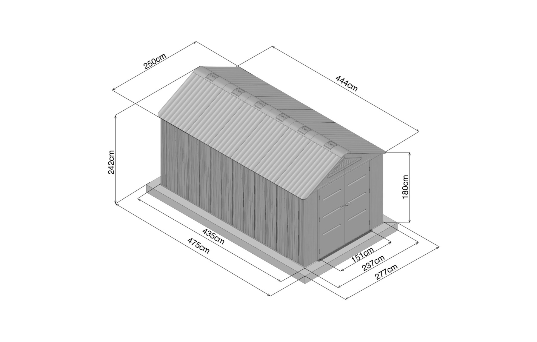 Plastový záhradný domček, vrátane podlahy, š 250 x d 444 x v 242 cm, zastavaná plocha 11,10 m2.