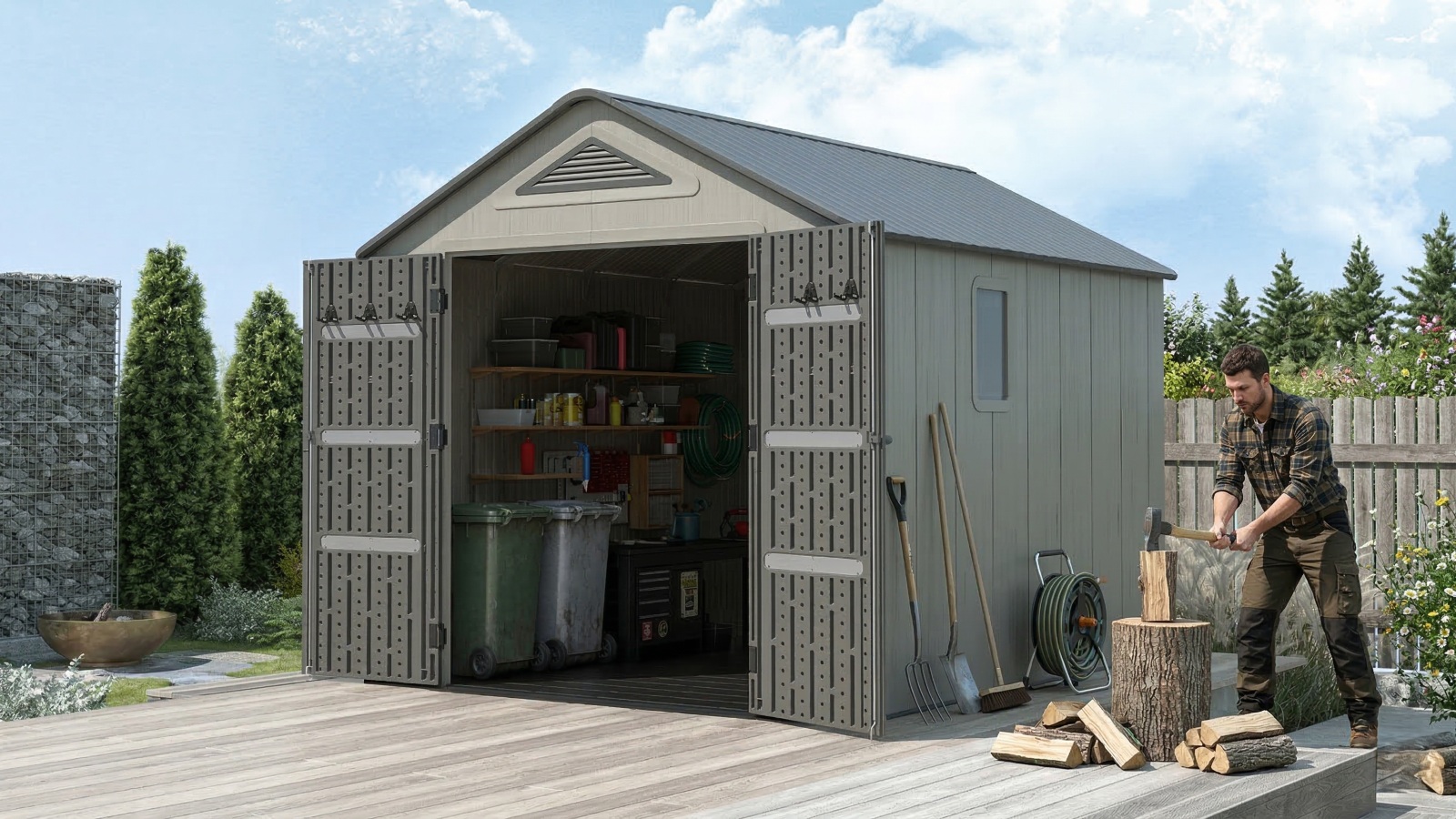 Robustný plastový domček "novej generácie" na uskladnenie záhradkárskych, športových, bazénových, grilovacích, campingových, motoristických a ďalších potrieb. Moderný design, jednoduchá montáž, celoročné použitie. Záhradný domček má nosnú kovovú konštrukciu a dvojité steny, strecha, dvojité dvere, podlaha sú vyrobené z masívneho veľmi odolného a prakticky nerozbitného plastu (vysokopevnostný polyetylén s UV filtrom). Plastová protišmyková podlaha je súčasťou domčeka (je v cene). Domček je vybavený dvojkrídlovými dverami na pántoch. Hrúbka dvojitej plastovej steny je 22 mm, hrúbka strechy je 36 mm. Sklon strechy je 30°, čo výrazne znižuje množstvo a tlak snehu na strechu. Materiál domčeka nežltne ani nekrehne, takže odpadá pravidelné natieranie domčeka ako je nutné v prípade napr. drevených domčekov - záhradný plastový domček je prakticky bezúdržbový. Domček je navrhnutý a vyrobený tak, aby montáž bola čo najjednoduchšia a najkratšia. Jednotlivé diely iba zaklapnete do susedných dielov a spoj zaistíte skrutkou.
