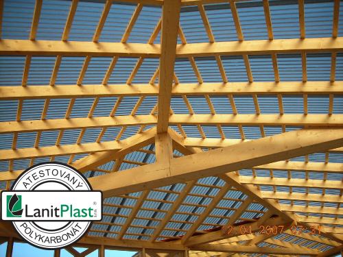 Číra polykarbonátová trapézová doska s jemnou povrchovou štruktúrou, hrúbka 0,8 mm, obojstranný 2UV filter.