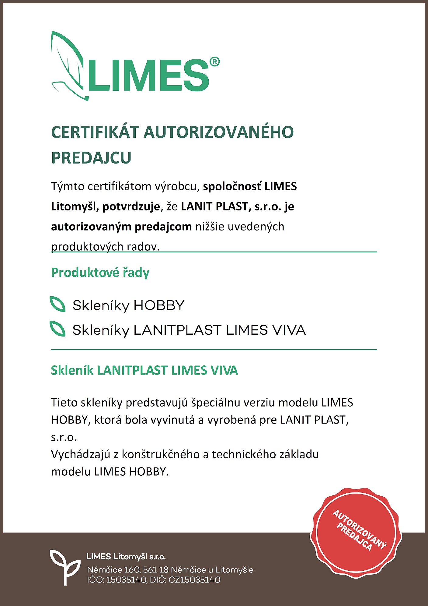 Skleník Lanitplast Limes VIVA V6 je vyrobený v spolupráci firiem Limes Litomyšl s.r.o. a LANIT PLAST, s.ro.