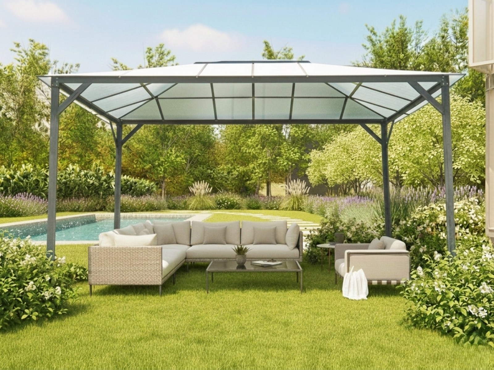 Hliníkový záhradný altán, rozmery 397 x 297 cm, konštrukcia farby antracit, strecha - číry komôrkový polykarbonát 6 mm.