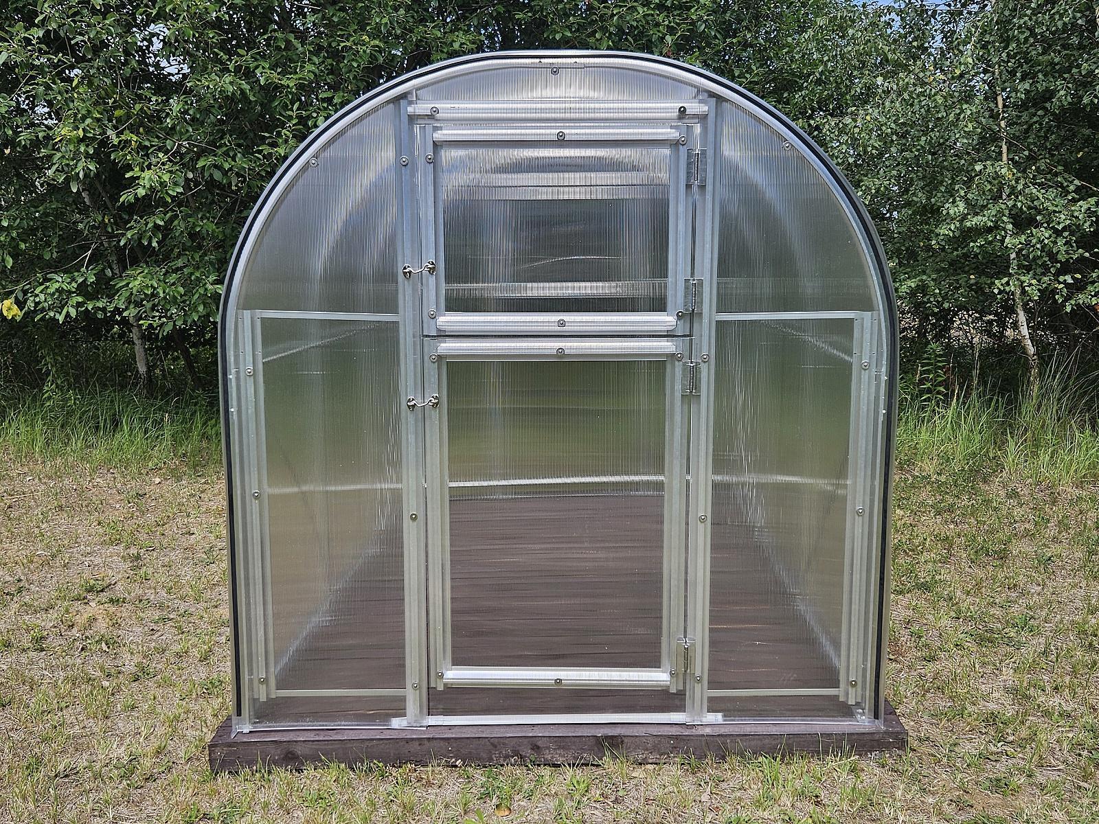 šířka 2,9 m, cca délky 4 / 6 / 8 m, masivní 1 mm silný a 65 mm široký eloxovaný hliníkový profil, rozteč oblouků 100 cmvnitřní podpěry obloukové konstrukce, dvojité dveře vpředu, ventilační okno vzadu, prosklení nutno vyřezat z dodaných polykarbonátových desek