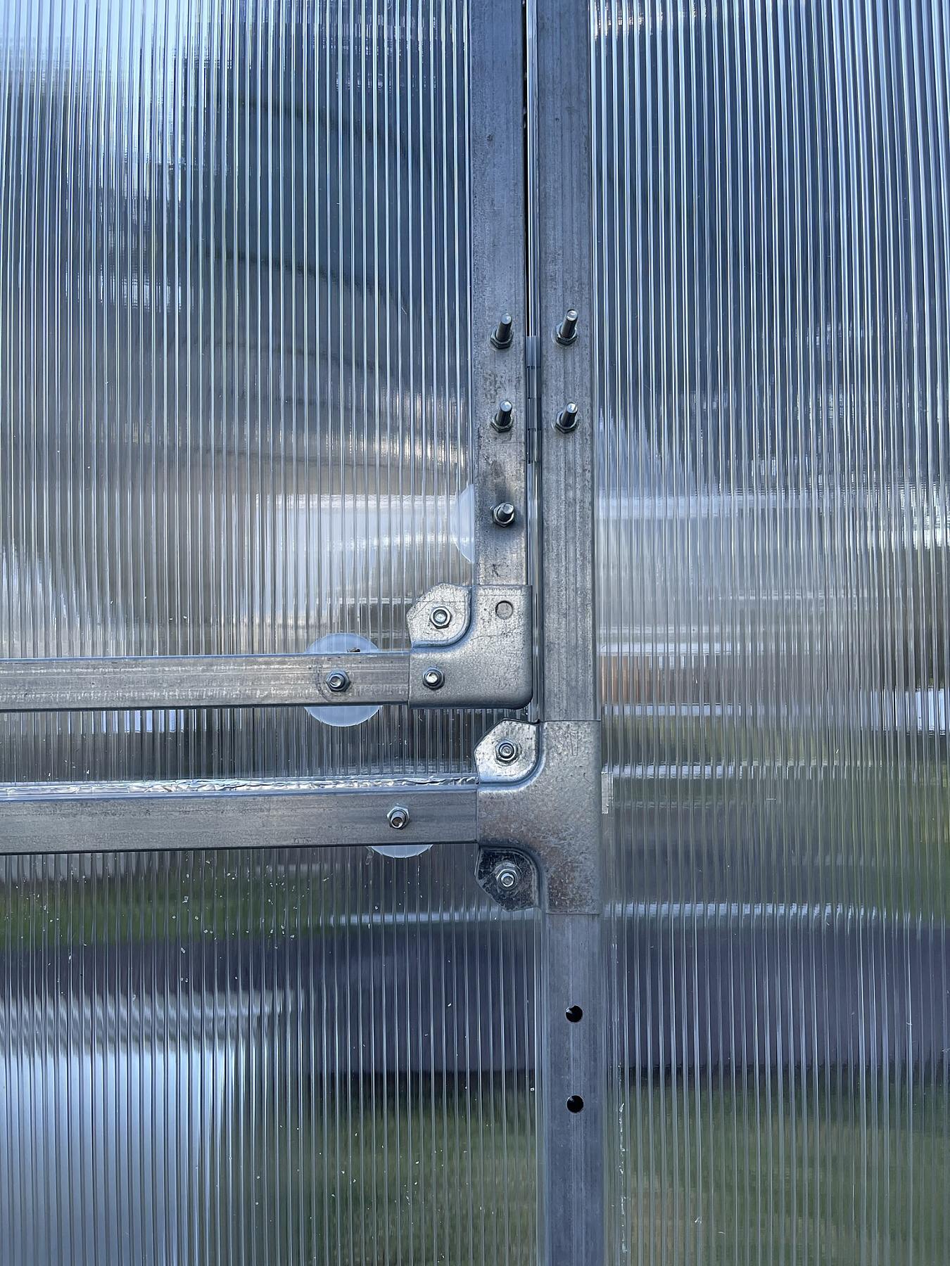 Velmi robustní konstrukce, 100% spolehlivost a jednoduchá montáž. Bytelný skleník pro zákazníky, kteří chtějí mít klidné spaní i při nejistém větrném počasí dnešní doby. Skleník má zvýšenou hustotu nosných oblouků na pouhých 67 cm od sebe, čímž se výrazně zvýšila odolnost celé konstrukce. Nosné oblouky jsou vyrobeny ze žárově pozinkované ocelové čtvercové trubky průřezu 20 x 20 mm a síle stěny cca 1 mm. Jednotlivé čtvercové trubky se do sebe zasouvají (systém podobný stanovým tyčkám a stanové konstrukci, jen výrazně mohutnější) a spoje se zajistí šroubem. Plastový polykarbonátový plášť je vyrobený z prémiového britského polykarbonátu se smluvní zárukou 10 let na nerozbitnost krupobitím. Jednotlivé profily se vzájemně sešroubují a po jejich sestavení vznikne velmi stabilní oblouková konstrukce bez nutnosti stavby skleníkové podezdívky. Skleník je vybaven kotvami přímo do země. Montáž skleníku zvládnete svépomocí ve dvou až třech osobách. V půdě se zahradní skleník upevňuje zakopáváním patek konstrukce do země, případně jejich zalitím do betonu (doporučujeme).
