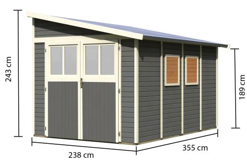 Dom drewniany do ściany, grubość ściany 19 mm, wymiary sz 238 x gł 355 cm, powierzchnia zewnętrzna domu 8,44 m2.