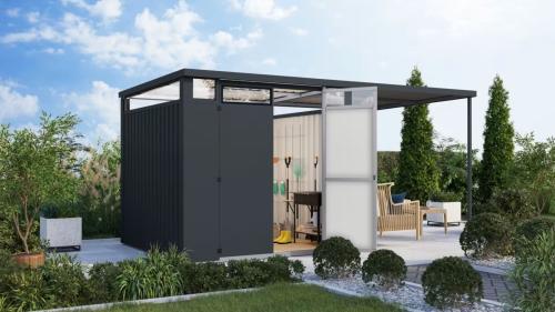 Metalowy domek ogrodowy, sz 448 / 232 x gł 230 x w 218 cm, kolor antracytowy.