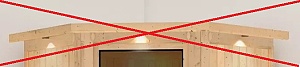 Sauna nie ma własnej podłogi i należy ją umieścić wyłącznie w pomieszczeniu z odpowiednią wykładziną podłogową, najlepiej płytkami. Saunę dostarczamy w wersji bez listwy sufitowej (profilu) przy suficie, wraz z oświetleniem LED 3 x 7,5 W.