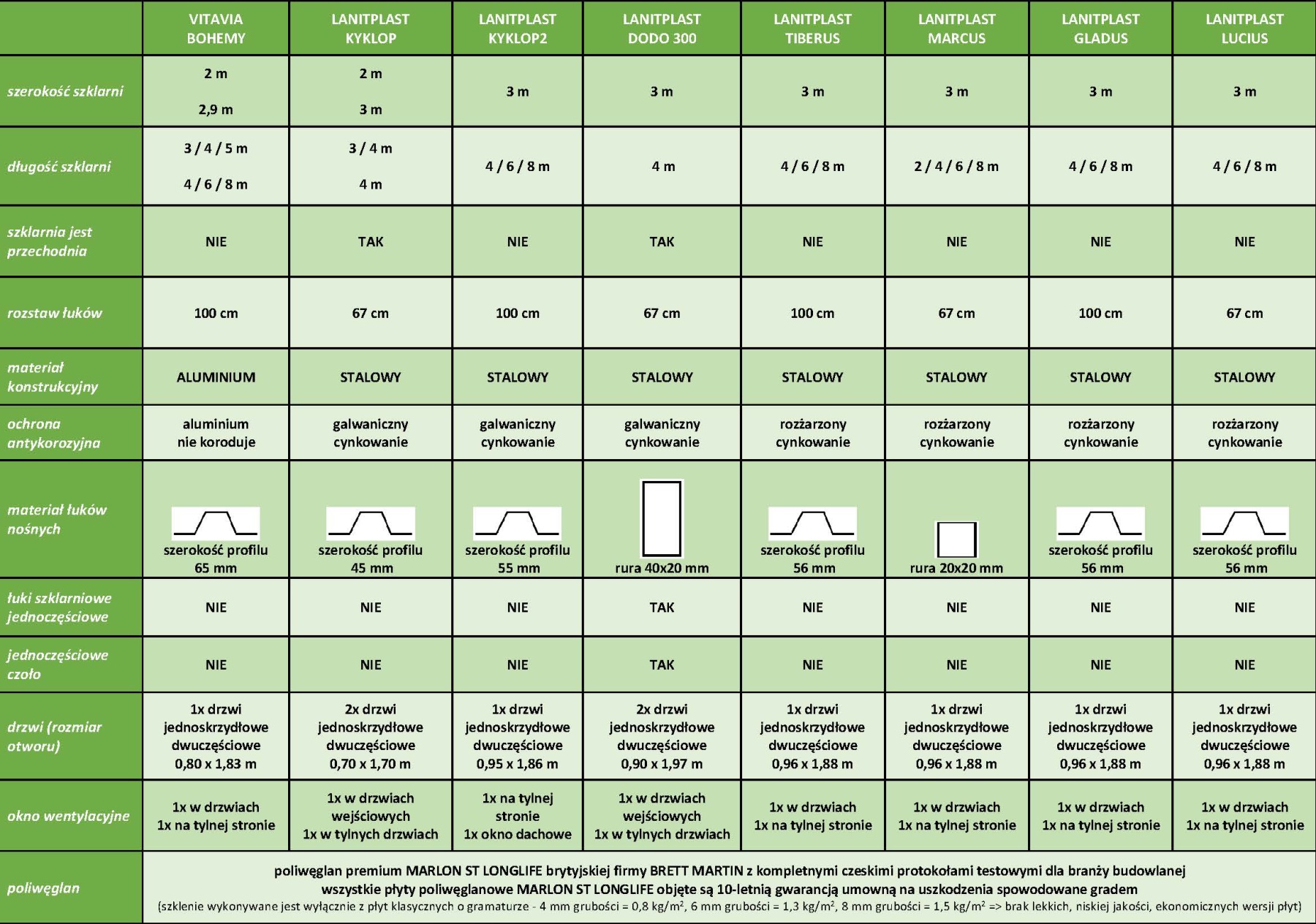 Wysokiej jakości brytyjski dwuścienny poliwęglan o grubości 6 mm z mocnym filtrem UV (dzięki czemu nie żółknie i nie staje się kruchy na słońcu). W celu zapewnienia maksymalnej jakości szklarni dostarczamy oszklenie konstrukcji wykonane z wysokiej jakości poliwęglanu MARLON (prod. Brett Martin, Wielka Brytania), który przeszedł wymagające testy w Czechach w akredytowanych przez państwo laboratoriach badawczych m.in. materiał budowlany. Dodatkowo posiada protokół badań Państwowego Instytutu Zdrowia w Pradze, który potwierdza, że z poliwęglanu nie wydzielają się żadne szkodliwe substancje. Dzięki temu możesz uprawiać warzywa bez obaw o swoje zdrowie. Umowna przedłużona gwarancja na niezniszczalność poliwęglanu pod wpływem gradu na okres 10 lat jest dla szklarni firmy LANIT PLAST oczywistością.